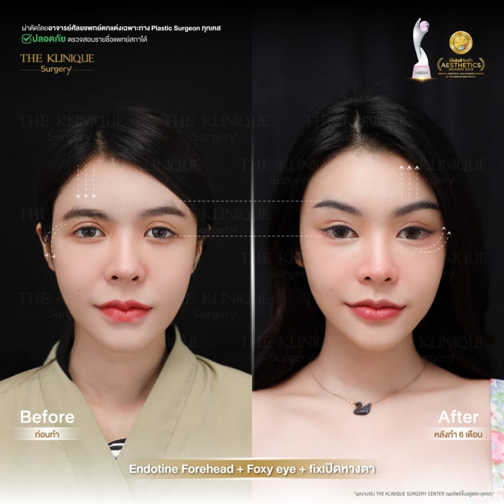 หลังจากปรึกษาคุณหมออั๋น แพทย์ผู้เชี่ยวชาญด้านการปรับรูปหน้า ก็ได้แนะนำ 2 หัตถการทำควบคู่กัน คือ ENDOTINE ยกคิ้ว และ Foxy Eyes ยกหางตา ซึ่งทั้งสองอย่างนี้ จะใช้เทคนิคการผ่าตัดแบบส่องกล้อง แก้ไขปัญหาลึกถึงชั้นกล้ามเนื้อ