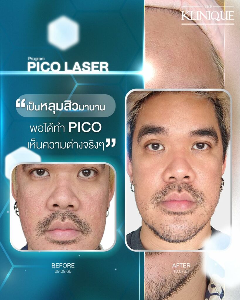 - Pico Laser หลุมสิว รูขุมขนกว้าง โดยทั่วไปจะเริ่มเห็นการเปลี่ยนแปลงหลังทำครั้งที่ 2-3 และจะเห็นผลลัพธ์ชัดเจนขึ้นเรื่อยๆ เมื่อทำต่อเนื่องอย่างน้อย 3-6 ครั้ง เว้นระยะห่างประมาณ 4-6 สัปดาห์