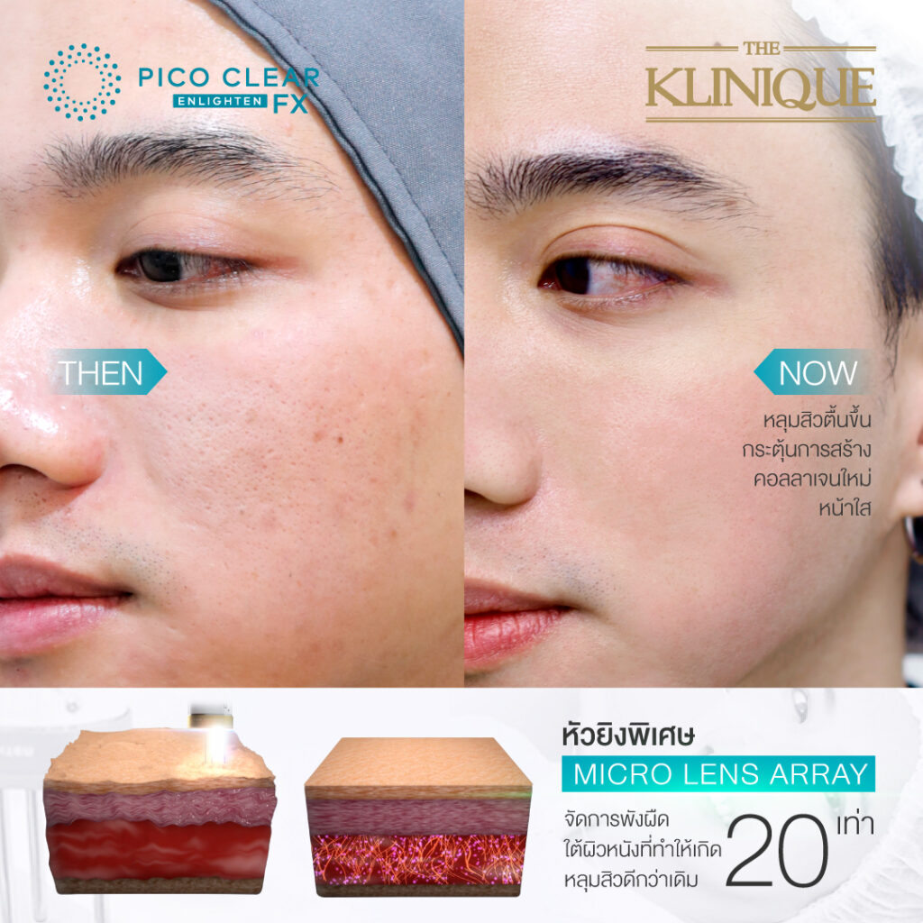 - การรักษารอยแผลเป็น หลุมสิว และฟื้นฟูผิว (Skin Rejuvenation) Pico Laser หลุมสิว ช่วยฟื้นฟูผิวให้กระชับและเรียบเนียนมากขึ้น ด้วยการปรับโหมด Handpiece แบบ Fractional ซึ่งเป็นการยิงพลังงานเลเซอร์ที่มีลำแสงขนาดเล็กหลายจุดไปยังชั้นหนังแท้ (Dermis) และทำให้เกิดแรงกระแทกจนเกิดฟองอากาศขนาดเล็กในชั้นผิว (Laser-Induced Optical Breakdown) เปรียบเสมือนการสร้างแผลขนาดเล็กโดยที่ผิวหนังชั้นบน (Epidermis) ไม่ได้รับความเสียหาย ฟองอากาศขนาดเล็กเหล่านี้จะไปกระตุ้นกลไกการซ่อมแซมตัวเองของเซลล์ผิว ทำให้เซลล์ Fibroblast สร้างคอลลาเจน (Collagen) และอีลาสติน (Elastin) ใหม่ขึ้นมาเป็นจำนวนมากเพื่อเติมเต็มโพรงอากาศให้กลับเข้าสู่สภาวะปกติ ผลลัพธ์ที่ได้คือ ผิวมีความหนาแน่น ยืดหยุ่น รูขุมขนกระชับ รอยหลุมสิวตื้นขึ้น รวมถึงริ้วรอยเล็กๆ ดูจางลง ช่วยให้ใบหน้าโดยรวมดูอ่อนเยาว์ขึ้นอย่างเป็นธรรมชาติ