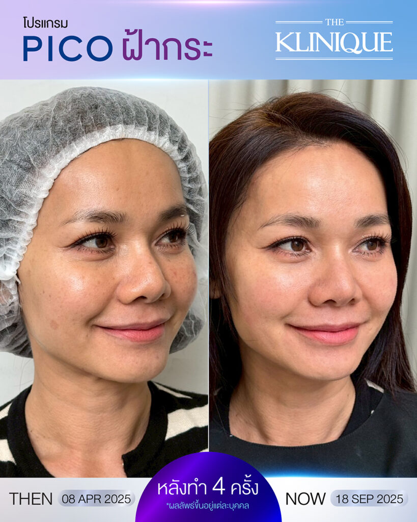 - เห็นผลลัพธ์ตั้งแต่ครั้งแรก หลังทำ Pico Laser ครั้งแรก จะค่อยๆ สังเกตเห็นความเปลี่ยนแปลงได้โดยไม่ต้องรอนานหลายเดือน ทั้งรอยสิว รอยแดง รอยดำ ฝ้า กระ ต่างๆ ที่ดูจางลง สีผิวดูกระจ่างใส ผิวเรียบเนียนและกระชับ ทั้งนี้ ผลลัพธ์อาจแตกต่างกันไปตามสภาพผิวและการดูแลหลังทำของแต่ละบุคคล โดยทั่วไปแพทย์จะแนะนำให้ทำ Pico Laser อย่างต่อเนื่องประมาณ 3-5 ครั้ง เพื่อให้เห็นผลลัพธ์ที่ชัดเจนและคงอยู่ได้ยาวนานยิ่งขึ้น