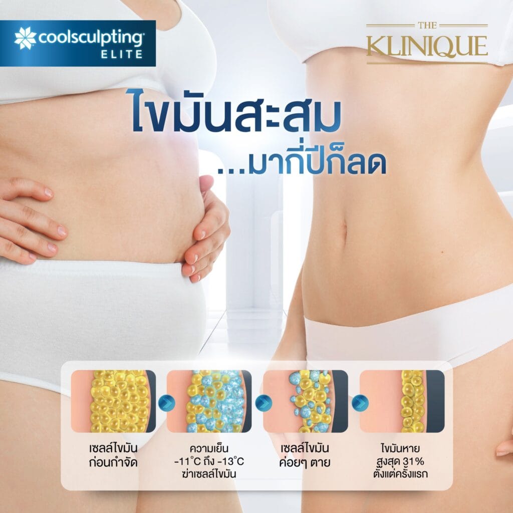 สำหรับผู้ที่ดูแลตัวเองแล้วแต่ยังมีปัญหาการลดไขมันหน้าท้องสะสมอยู่ อาจพิจารณาโปรแกรมสลายไขมัน ด้วยเทคโนโลยีสลายไขมันด้วยความเย็นระดับสูง ไม่ต้องผ่าตัด ไม่ต้องพักฟื้น ด้วยโปรแกรม Coolsculpting Elite ที่ THE KLINIQUE ที่ใช้ความเย็นทำลายเซลล์ไขมัน พร้อมระบบควบคุมอุณหภูมิที่มีความปลอดภัยสูง ช่วยแก้ปัญหาหน้าท้องใหญ่ รอบเอวหนา ต้นแขนย้วย ต้นขาเผละและปัญหาไขมันส่วนเกิน จึงเป็นทางเลือกของการลดไขมันหน้าท้องหรือสลายไขมันเฉพาะจุดได้อย่างปลอดภัย โดยสามารถลดไขมันเฉพาะจุดได้สูงถึง 27-31% ตั้งแต่ครั้งแรกที่ทำ (ขึ้นอยู่กับปัญหาและสภาพร่างกายของแต่ละบุคคล)