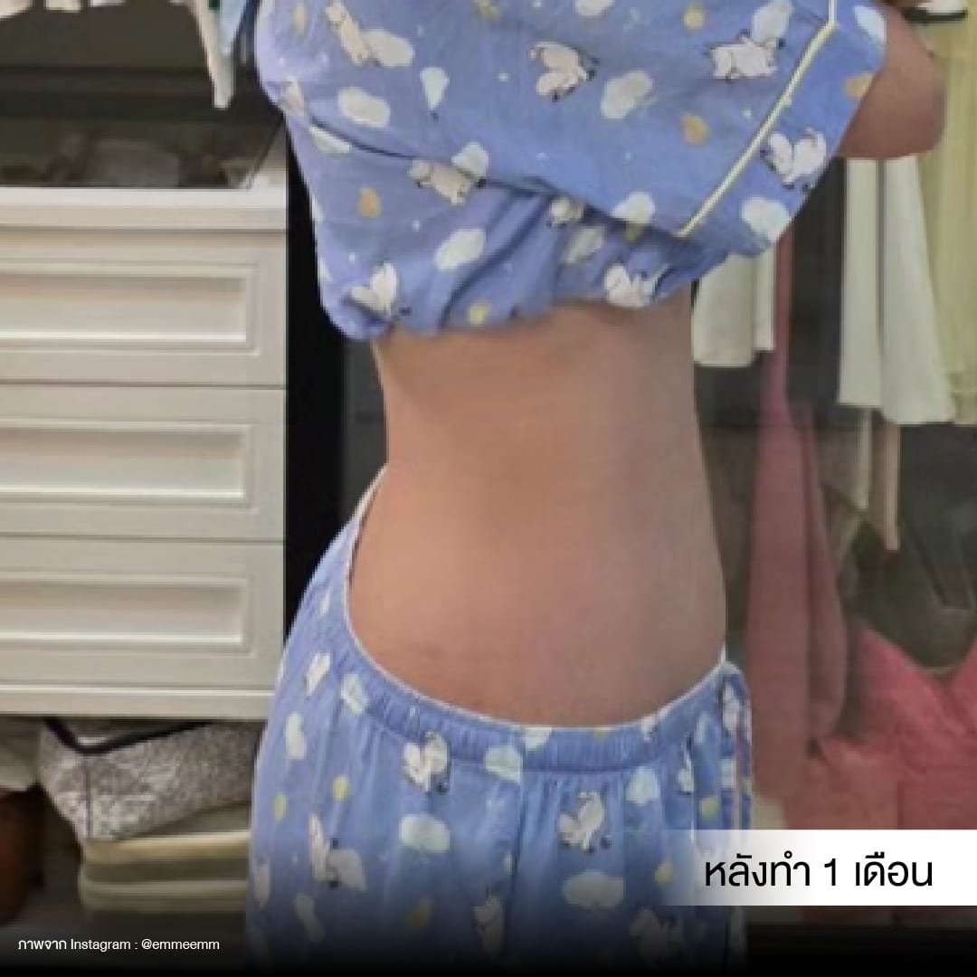 พอเริ่มเข้าเดือนถัดมา สัดส่วนเปลี่ยนอีกครั้ง กลายเป็นสาวไซซ์ XS ไปเลย เพราะเอวลดลงเหลือเพียง เอว 23 นิ้ว หุ่นดีขึ้นกว่าตอนก่อนมีลูก ลดไซซ์ เปลี่ยนเสื้อผ้าใหม่แบบยกตู้กันเลยทีเดียว การปรับสัดส่วนด้วยวิธีการดูดไขมัน เป็นทางลัดที่เห็นผลลัพธ์ได้เร็ว และเห็นผลได้จริง