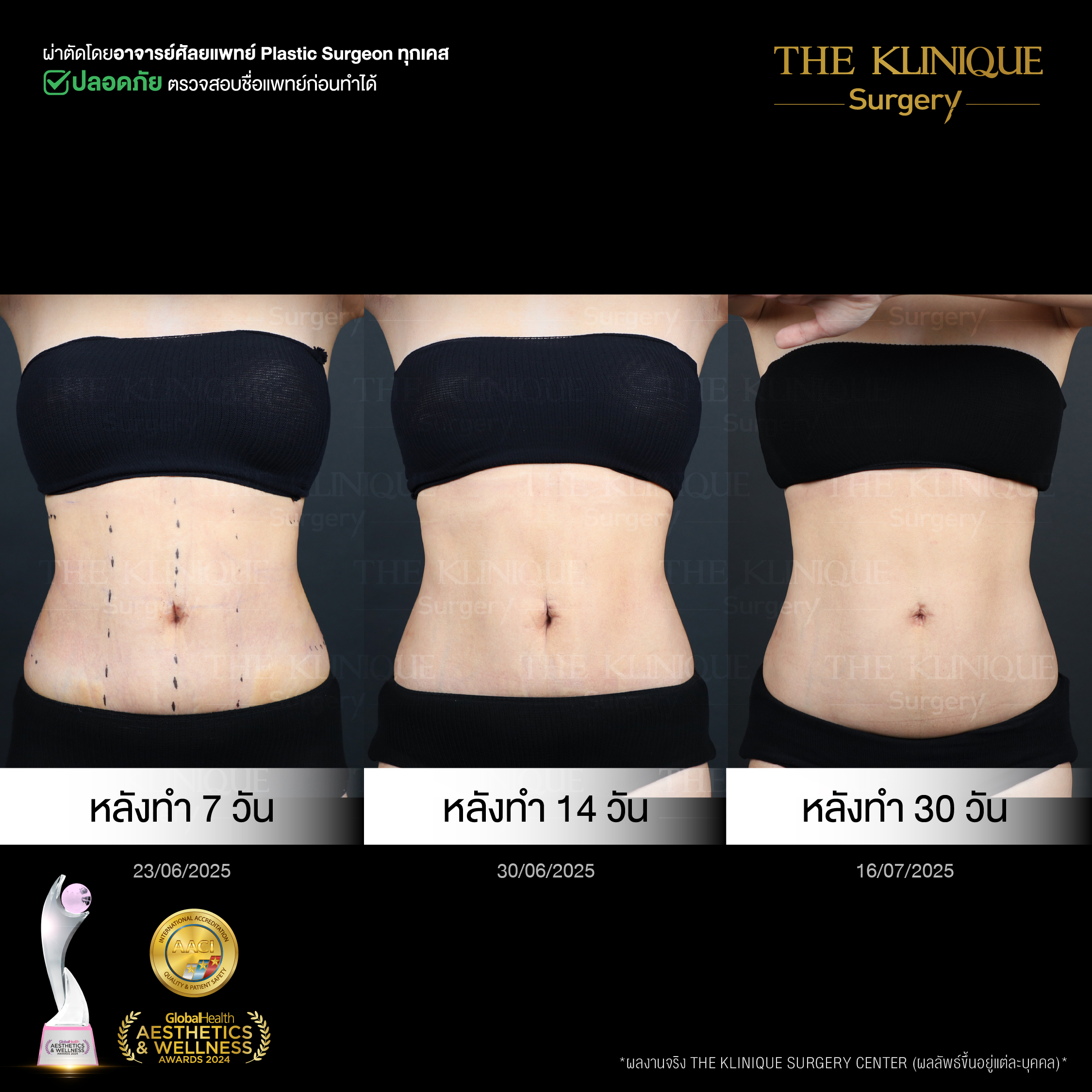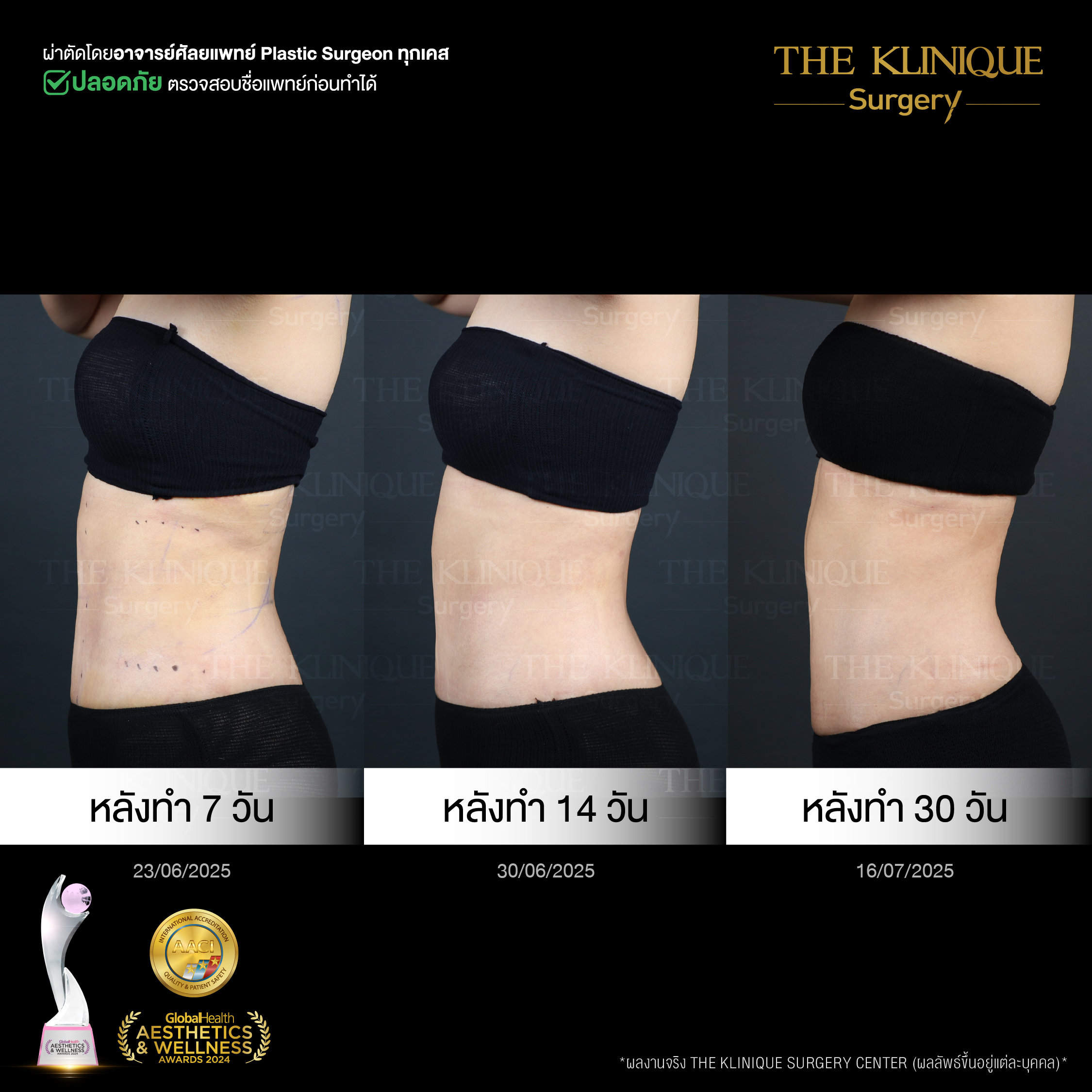 Update หลังดูดไขมัน เปิดทริคสำคัญเพื่อให้ได้ผลลัพธ์เข้าที่ไวยิ่งขึ้น สำหรับคุณเอ็ม ในสัปดาห์แรก หลังกลับบ้านไป มีอาการระบมช้ำ งดและหลีกเลี่ยงกิจกรรมหนักๆ แต่พอเข้าสู่สัปดาห์ที่ 2 รอยช้ำ และการอาการบวมลดลง พอเข้าสู่ week ที่3 เอวหาย 2 นิ้ว วัดสัดส่วนเอวอยู่ที่ 26 ใกล้เคียงกับที่คิดไว้แล้ว และสัดส่วนจะเล้กลงไปอีก ซึ่งตลอดระยะเวลาหลังดูดไขมัน จะต้องใส่ชุดกระชับสัดส่วนไว้ตลอด และจะเห็นผลลัพธ์สุดจึ้ง ใส่ต่อ อีก 1-3 เดือน สัดส่วนจะยิ่งเข้าที่มากขึ้นเรื่อยๆ ตอนนี้พุงหาย เอวเริ่มมา เอวคอด เอวเอส และที่สำคัญมีร่อง 11 หรือ Sexy Line ขึ้นมาแล้ว หลังครบสองเดือน จะอัปเดตหุ่นใหม่สุดจึ้งกันอีกครั้ง