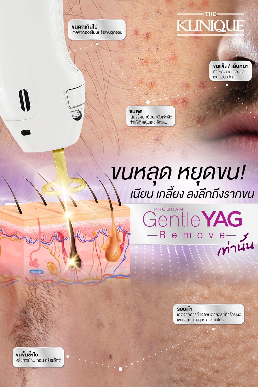 โปรแกรม Gentle YAG Remove คือโปรแกรมเลเซอร์กำจัดขนด้วยเครื่อง Gentle YAG รุ่นใหม่ล่าสุดนำเข้าจากอเมริกา ใช้พลังงานเลเซอร์ที่มีความยาวคลื่น 1,064 นาโนเมตร ซึ่งลงลึกเข้าสู่ชั้นผิวได้ 5-7 มิลลิเมตร ช่วยกำจัดเส้นขนได้ลึกถึงชั้นรากขน พร้อมเทคโนโลยี DCD™ ปกป้องผิวด้วยความเย็น ไม่ทำให้ผิวเบิร์นแดง แสบไหม้ เหมาะกับทุกสีผิวและเส้นขนทุกประเภท สามารถใช้ได้กับผิวที่มีความบอบบางมากเป็นพิเศษ เช่น ใบหน้า รักแร้ หน้าอก และจุดซ่อนเร้น หลังทำเสร็จอยู่ได้นาน 1-2 ปี ขึ้นกับลักษณะเส้นขน ฮอร์โมน และการดูแลตัวเองของแต่ละบุคคล